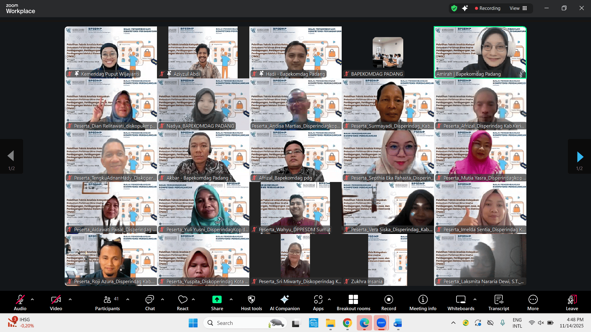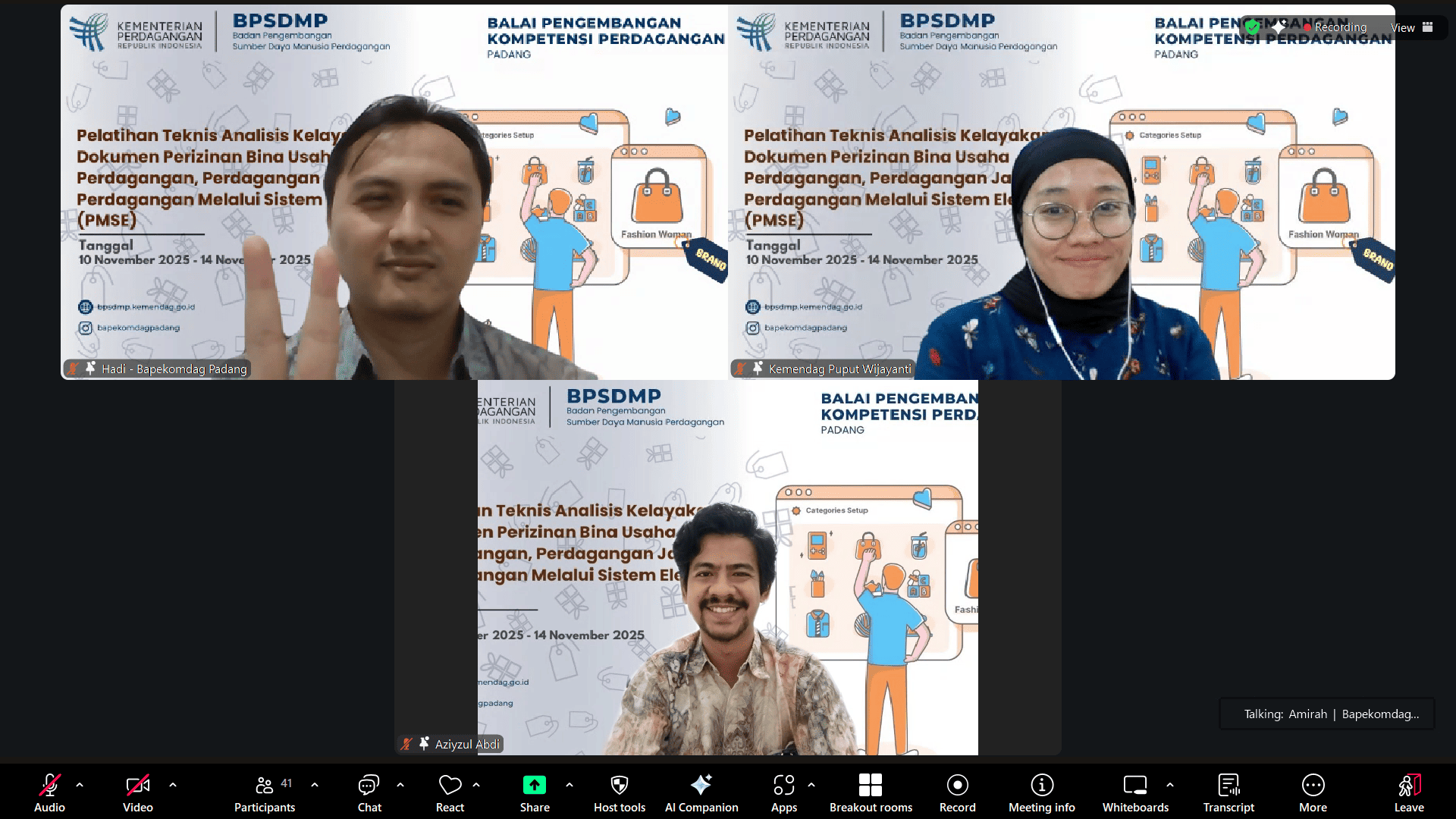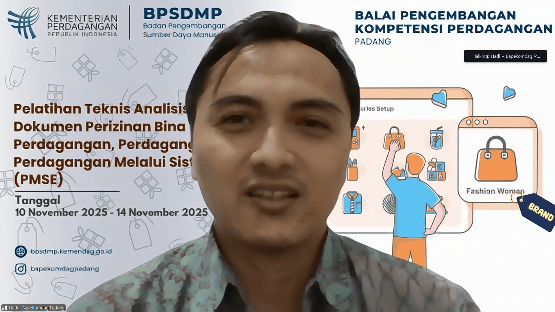Pelatihan Teknis Analisis Kelayakan Penerbitan Dokumen Perizinan Bidang Bina Usaha Perdagangan, Perdagangan Jasa, dan Perdagangan Melalui Sistem Elektronik (PMSE) yang diselenggarakan secara daring oleh Balai Pendidikan dan Pelatihan Ekspor Indonesia (Bapekomdag) Padang resmi ditutup pada Jumat, 14 November 2025. Pelatihan yang berlangsung selama 5 (lima) hari ini diikuti oleh para peserta dari berbagai instansi pemerintah daerah yang membidangi urusan perdagangan di tingkat provinsi dan kabupaten/kota di wilayah kerja Bapekomdag Padang yaitu Pulau Sumatera, Kepulauan Riau dan Kepulauan Bangka Belitung. Kegiatan tersebut dirancang untuk meningkatkan kompetensi aparatur dalam memahami proses analisis kelayakan perizinan, penguatan regulasi, serta penerapan ketentuan teknis terkait PMSE dan sektor perdagangan jasa.