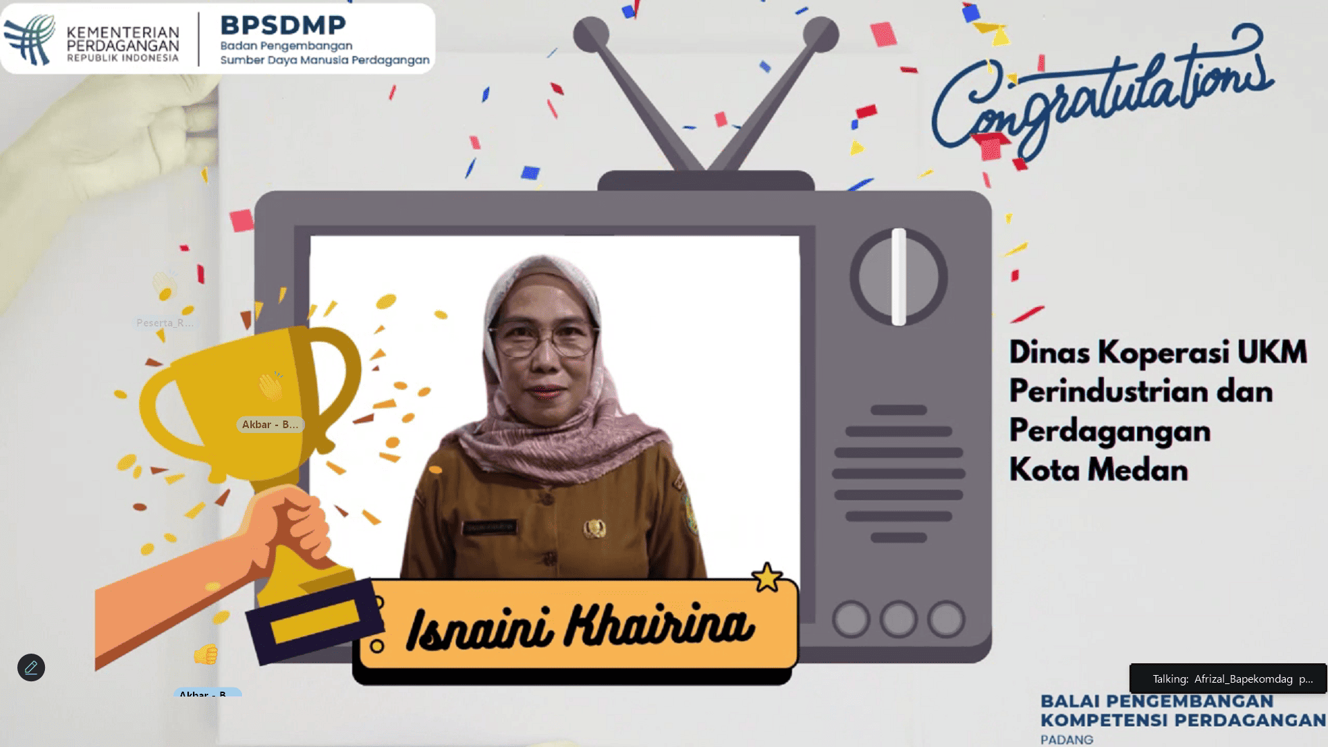Pada penutupan pelatihan, panitia juga mengumumkan peserta terbaik yang dinilai berdasarkan keaktifan, kedisiplinan, evaluasi setiap tahapan pembelajaran serta penilaian aktifitas studi kasus dan seminar hasil, Adapun peserta yang berhasil meraih peringkat terbaik adalah: 1. Juara I : Isnaini Khairina dari Dinas Koperasi, UKM Perindustrian dan Perdagangan Kota Medan 2. Juara II : Dian Relitawati dari Dinas Koperasi, UKM Perindustrian dan Perdagangan Kota Medan 3. Juara III : Riya Moulina dari Dinas Perdagangan Koperasi UKM Kota Padang Panjang Penghargaan ini diberikan sebagai bentuk apresiasi atas dedikasi dan kemampuan peserta dalam menyerap materi serta berkontribusi aktif sepanjang pelatihan. Panitia berharap prestasi tersebut dapat menjadi motivasi bagi seluruh peserta untuk terus meningkatkan kompetensi di bidang perizinan dan pelayanan publik.