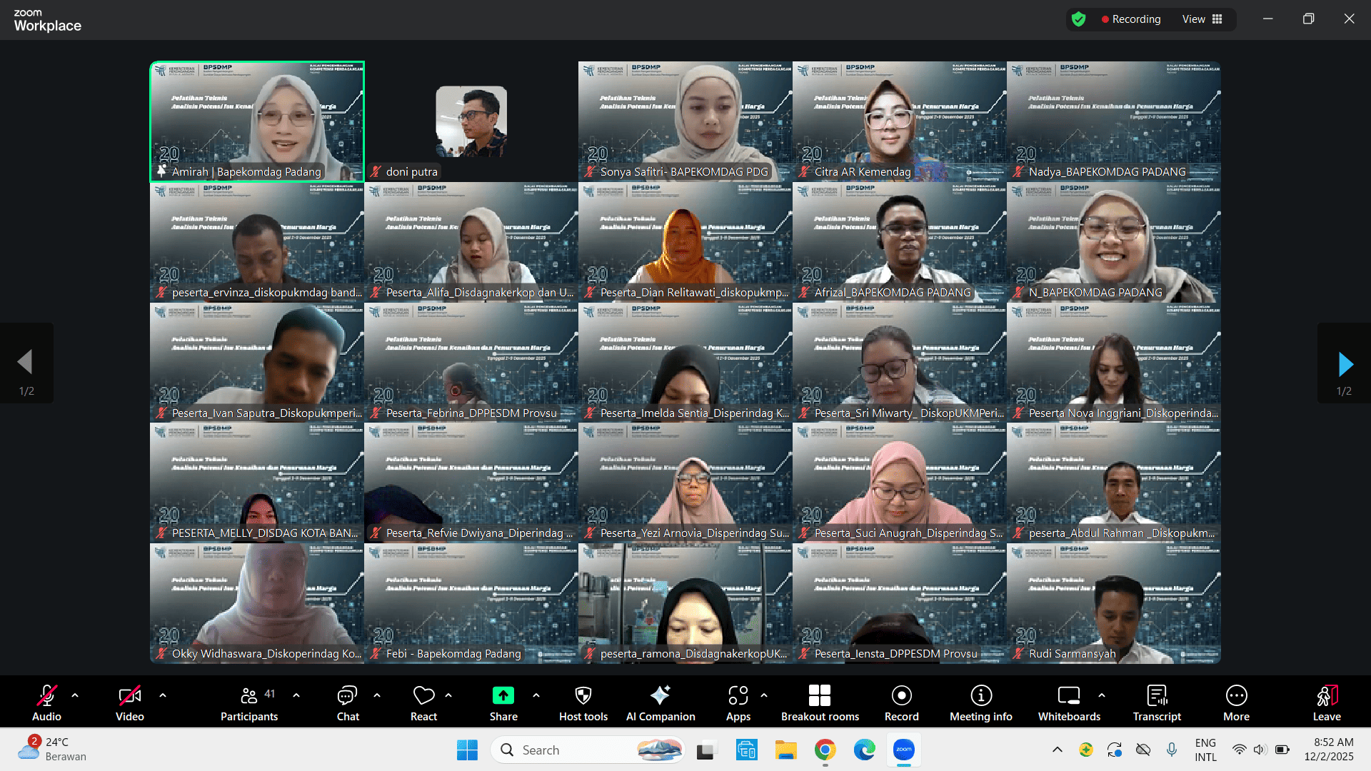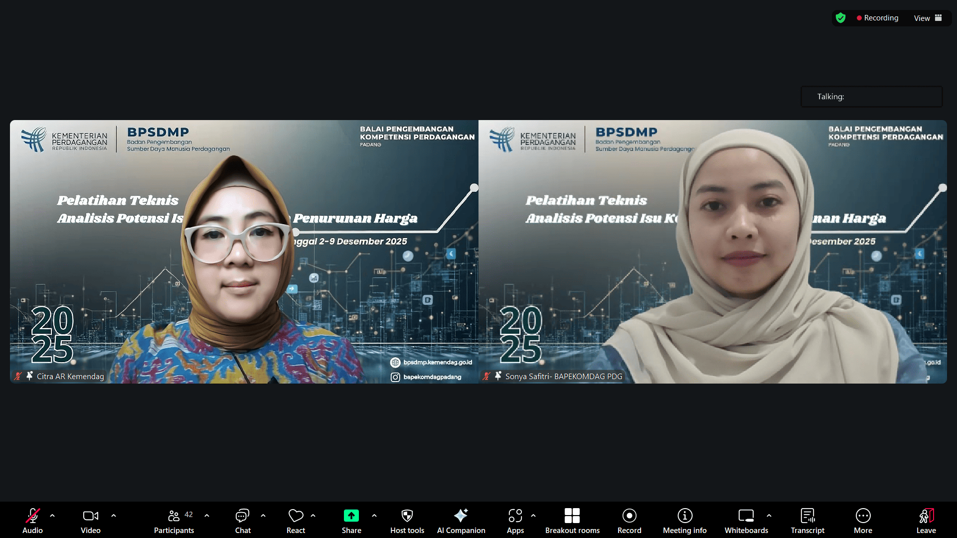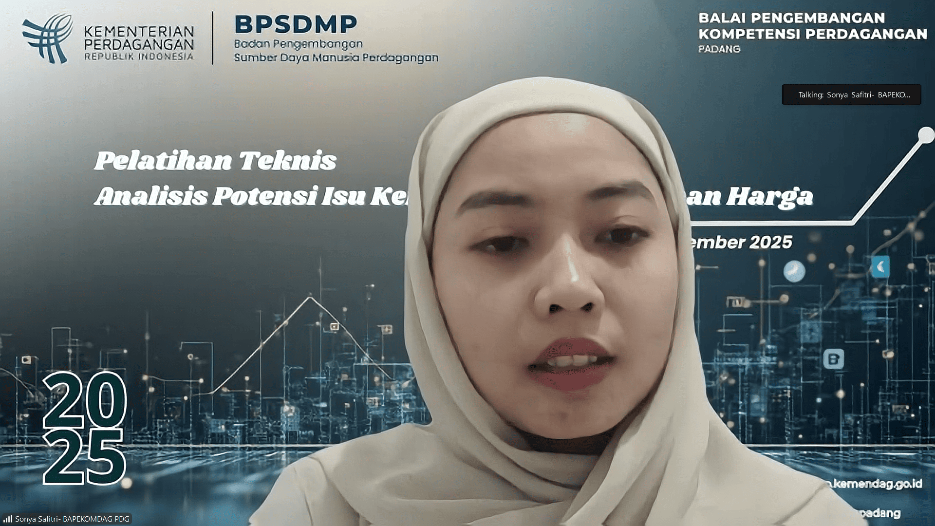 Kepala Bapekomdag Padang yang diwakili oleh Kepala Sub Bagian Tata Usaha Ibu Sonya Safitri, melaporkan bahwa pelatihan ini diikuti oleh 30 orang peserta yang berasal dari dinas perdagangan provinsi maupun kabupaten/kota di wilayah kerja Bapekomdag Padang, yaitu Pulau Sumatera, Kepulauan Riau, serta Kepulauan Bangka Belitung. Pelatihan ini dilaksanakan secara fully online mulai hari ini, Selasa, 2 Desember hingga Selasa, 9 Desember 2025. Selanjutnya, pelatihan dibuka secara resmi oleh Kepala Pusat Pengembangan Kompetensi Aparatur Perdagangan (Pusbangkom AP) dalam hal ini diwakili oleh Kepala Bagian Tata Usaha Ibu Citra Andina Rosa. Dalam sambutannya, beliau menegaskan bahwa Analisis potensi isu harga dilakukan untuk mengidentifikasi komoditas yang berpotensi mengalami kenaikan maupun penurunan harga, beserta faktor pemicunya. Tujuannya adalah menyediakan peringatan dini (early warning) agar pemerintah dapat melakukan keputusan strategis maupun langkah antisipatif dalam menjaga stabilitas harga dan ketersediaan barang di masyarakat. Beliau berharap pengetahuan dan keterampilan yang diperoleh dapat diterapkan dengan baik dalam menunjang tugas dan fungsi masing-masing aparatur perdagangan di daerah.